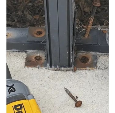 This service is included as part of the pool cage restoration process. In this instance, we will replace every individual screw with stainless steel alternatives. These screws will never rust, and the warranty provided will be everlasting. Bella's Screen Corp. also replaces every individual screw during the rescreening process should the client request it. While it is often unnecessary to replace all screws, we offer this service as a precaution. Occasionally, screws can become damaged, which may compromise the structure's integrity. We ensure that any replacement screws fit correctly, typically opting for a size that is larger than the previous ones to guarantee the security and stability of the aluminum structure.